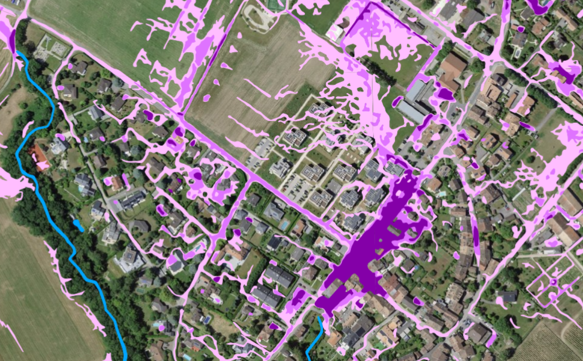 Map illustrating potential surface water runoff and localized flooding during heavy rainfall. Based on public data from the Swiss Federal Office for the Environment (FOEN/BAFU). The map shows modeled indications, not observed flood events.[3].
